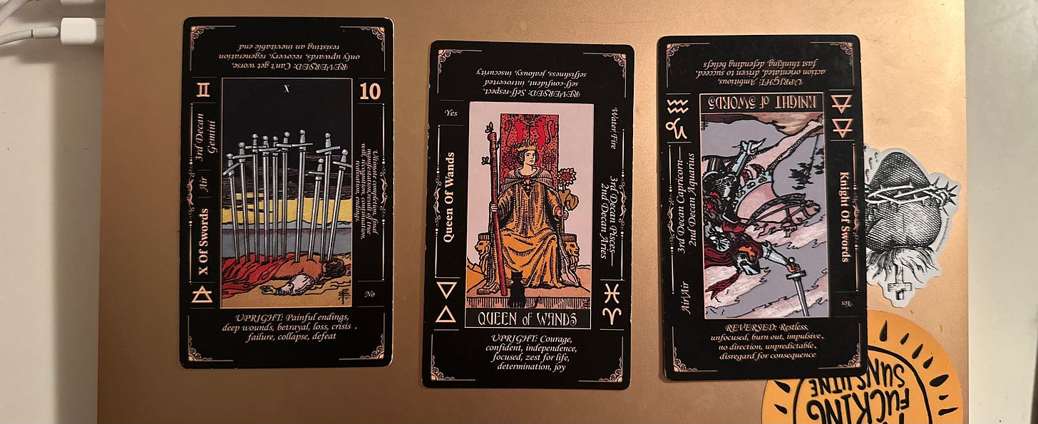 Cards: Ten of Swords, Queen of Wands, Knight of Swords Reversed