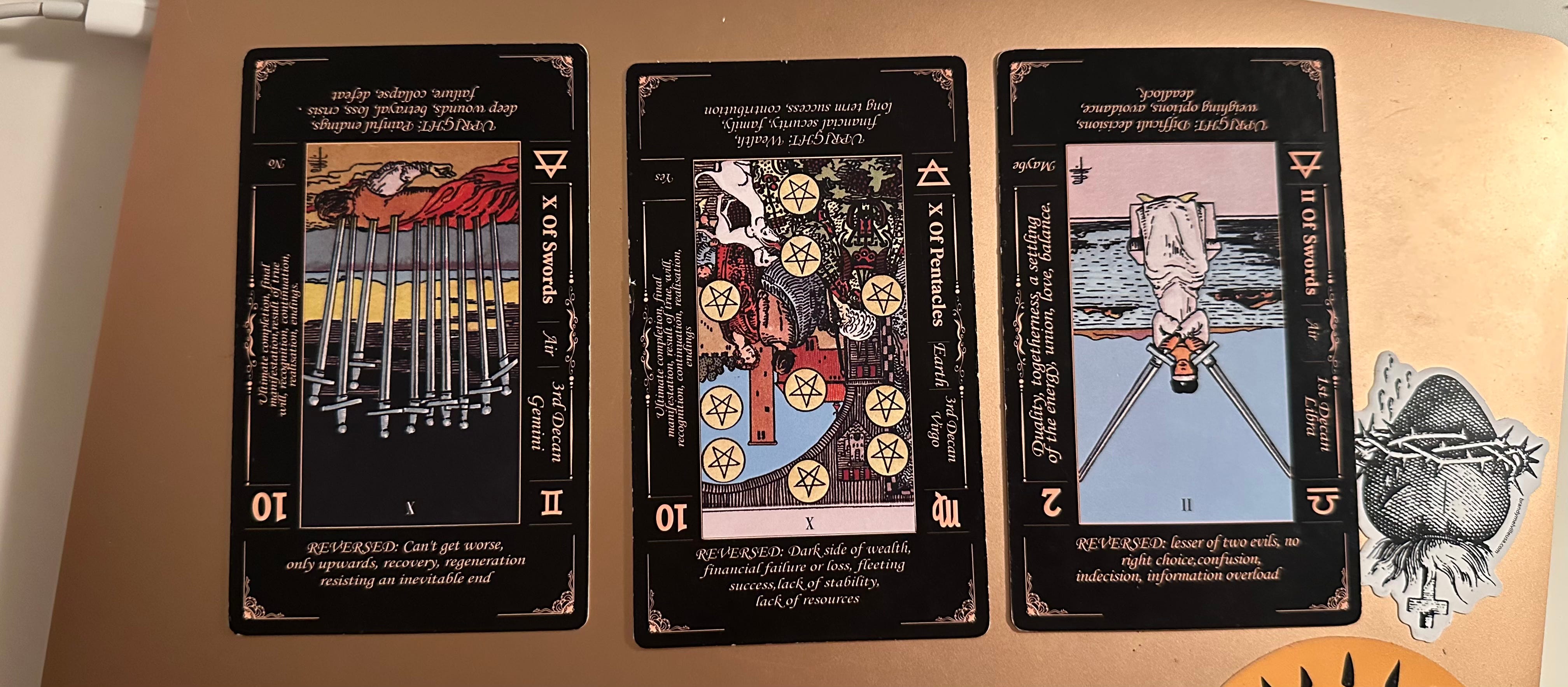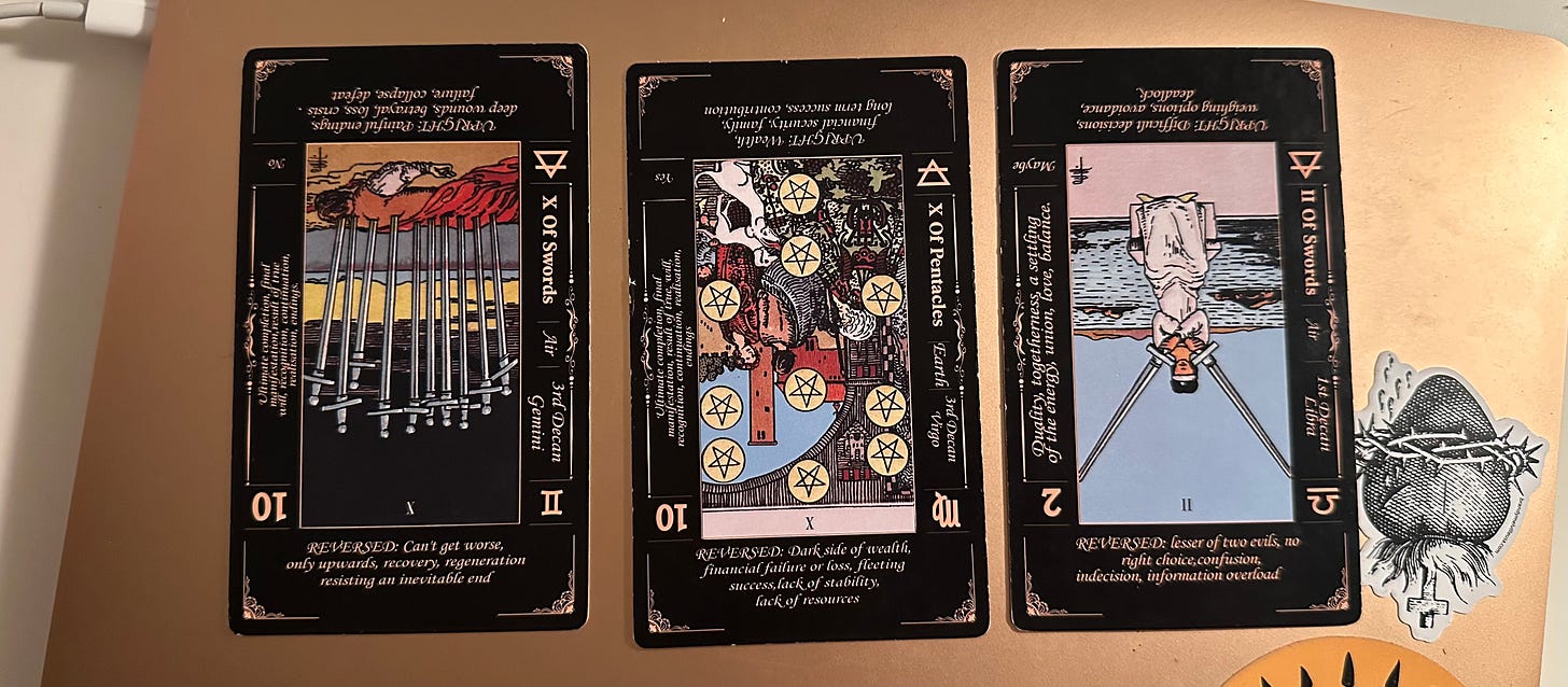 Cards: Ten of Swords Reversed, Ten of Pentacles Reversed, Two of Swords Reversed