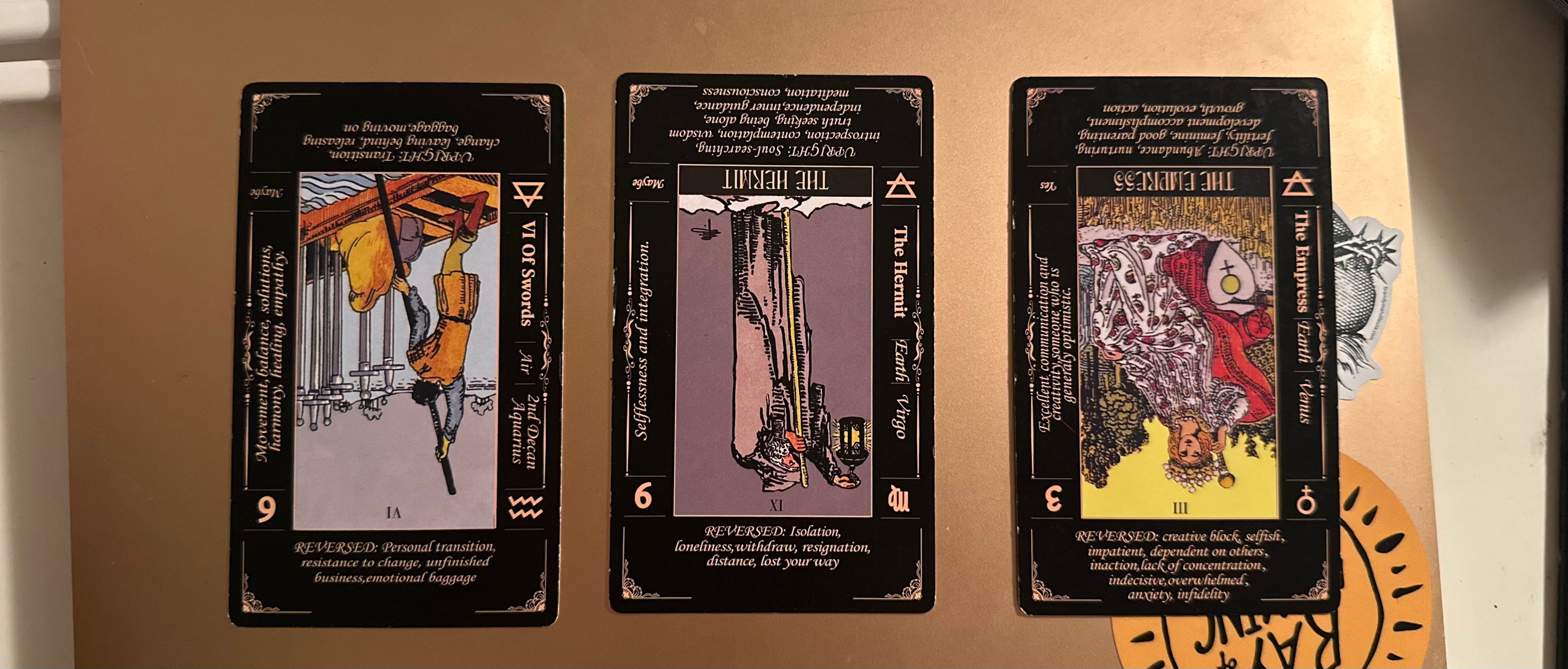 Cards: Six of Swords Reversed, Hermit Reversed, The Empress Reversed