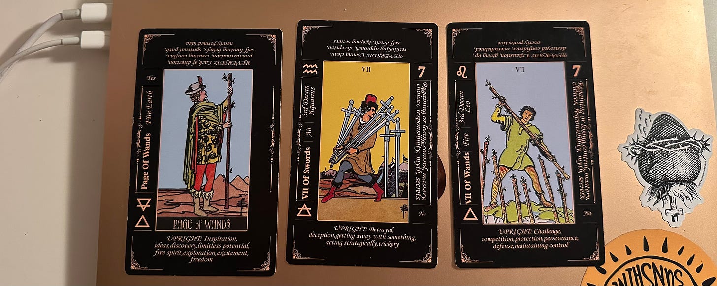 Cards: Page of Wands, Seven of Swords, Seven of Wands