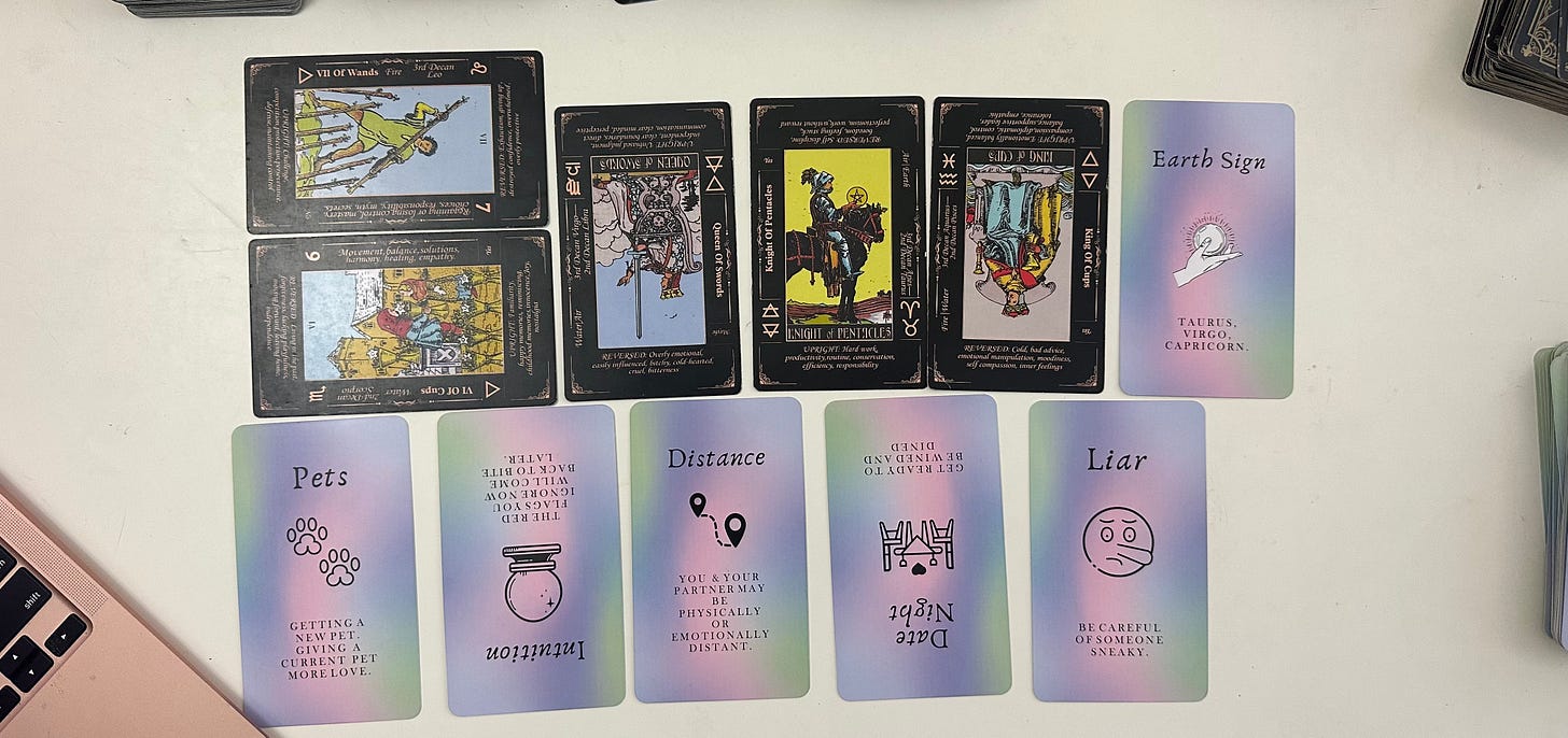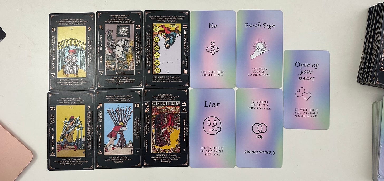 To clarify, I pulled No, Earth Sign, Liar, Commitment Reversed, and Open Your Heart.