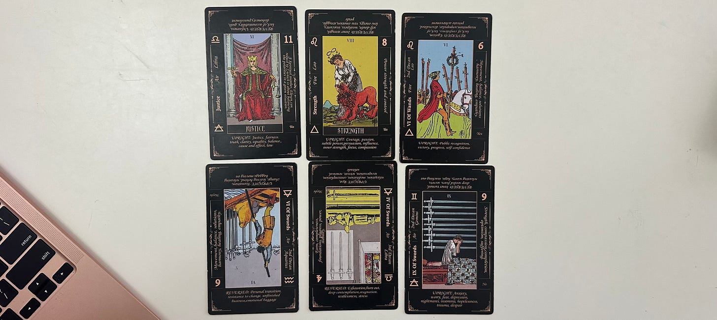 With Justice by your side, truth and fairness are at play. If you’ve been waiting for karmic balance to be restored, this could be your moment. However, The Four of Swords reversed and The Nine of Swords suggest that stress, exhaustion, or anxiety may have preceded this success or will follow it. Imposter syndrome or fear of attention could creep in, but trust that things are shifting in your favor! The victory you’re stepping into is hard-won, but it’s proof of your resilience.