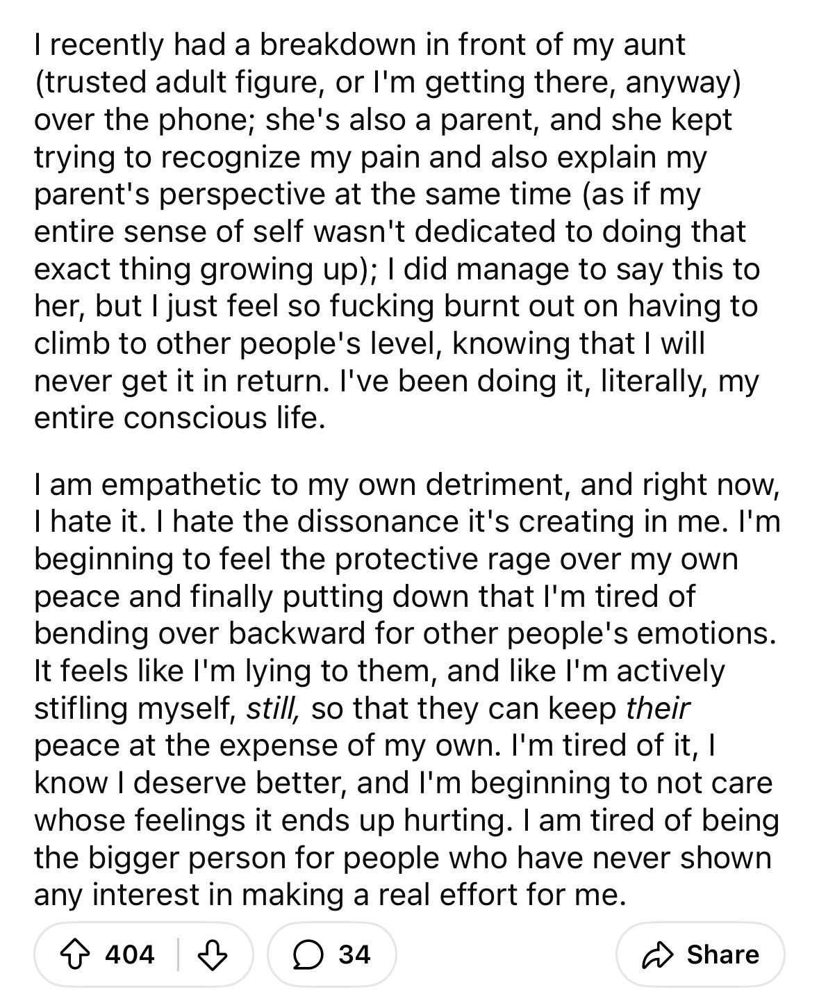 Sometimes, meeting someone where they’re at is no longer an option if it’s hurting you—especially at our big age. It becomes a matter of conscious choices that people consistently make and you consistently choose to receive. I’ve stretched myself so thin, offering patience, grace, and understanding, often at the expense of my own well-being. I’ve literally been “empathetic to my own detriment” as the OP of the reddit thread said.