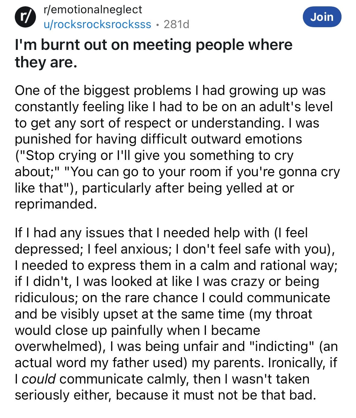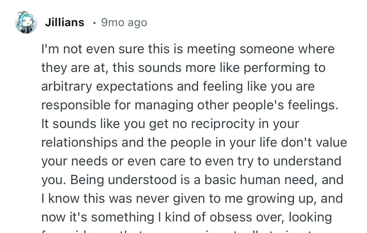 For me, my frustrations were very clearly communicated in a Reddit thread I came across that put a lot of what I’m currently feeling into words: “I feel so burnt out constantly trying to meet another person where they're at, knowing I’m not getting it in return.”
