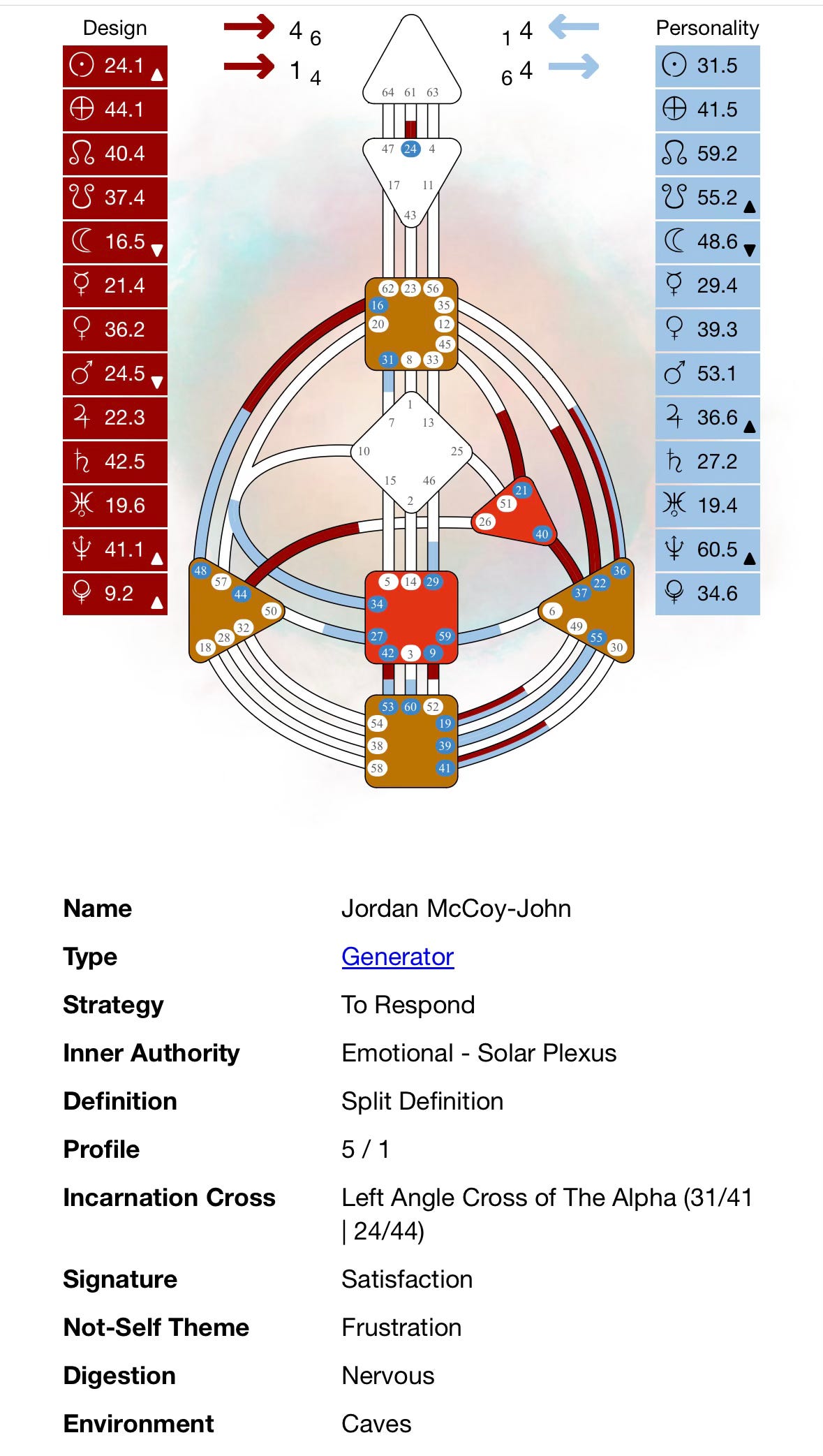 I’ve mentioned how I use astrology to analyze myself but another method I discovered is human design. According to certified analyst Lynette Hagins, “Human Design offers a map, or a manual, that indicates how you are unique as a person, and guides you in living in a manner that is in sync with who you are. When we live in alignment with our true nature, we begin to experience a level of comfort and acceptance for who we are, instead of chasing who we are not—and we’re able to live out our real purpose in the world.” Similar to astrology, human design uses your birth date, time, and location to generate a chart like this: