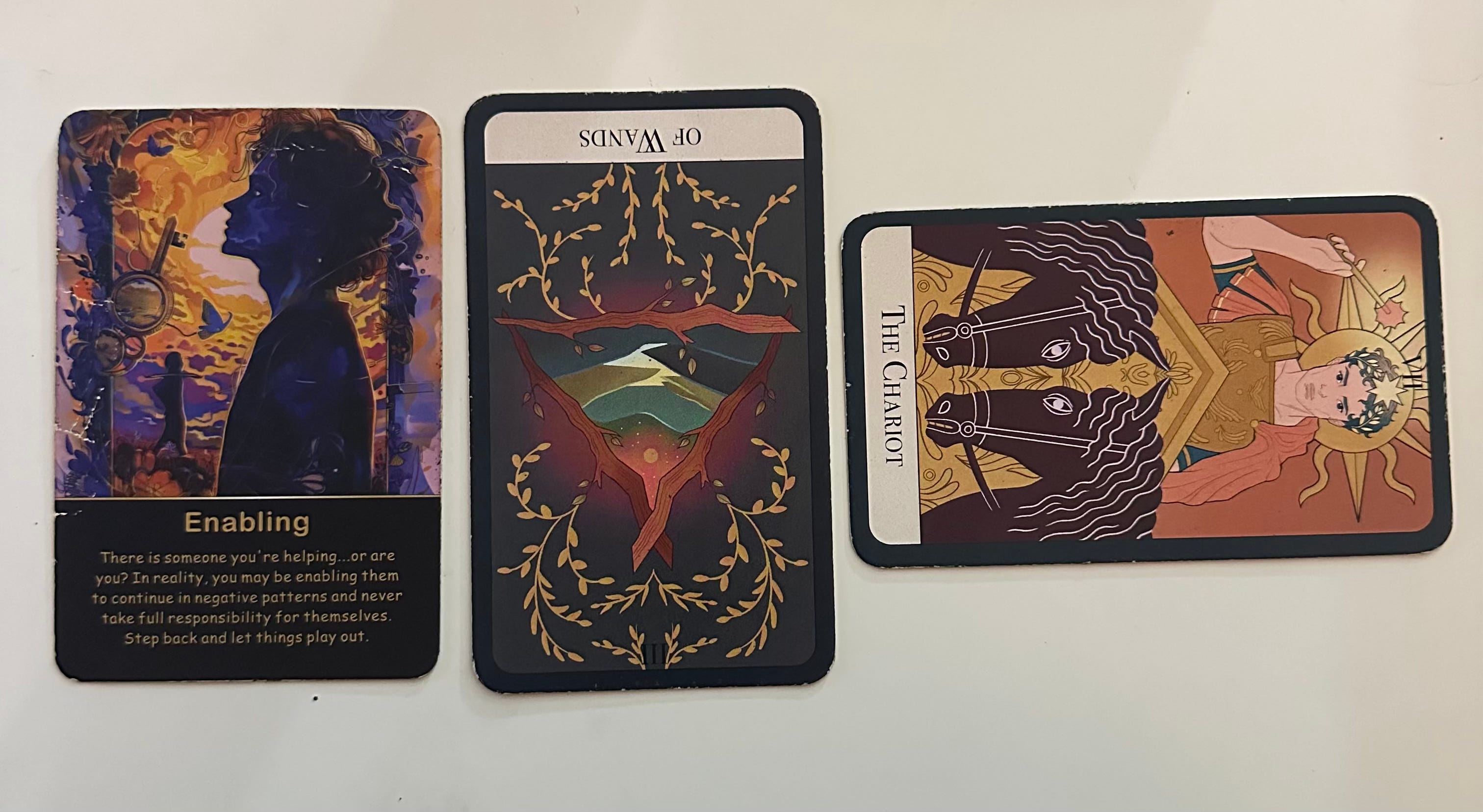 You’re looking at Enabling, the Three of Wands reversed, and The Chariot sideways to the right. And honestly… this is even more confirmation that it’s time to depart from something that’s no longer moving. More specifically, this could be a person or situation you think you’re helping, but you’re really enabling the continuation of a cycle that’s supposed to be ending.