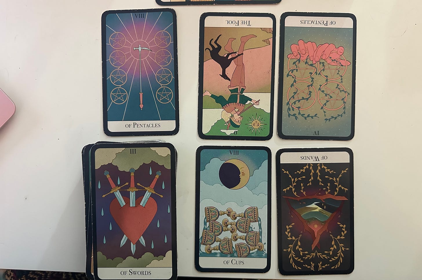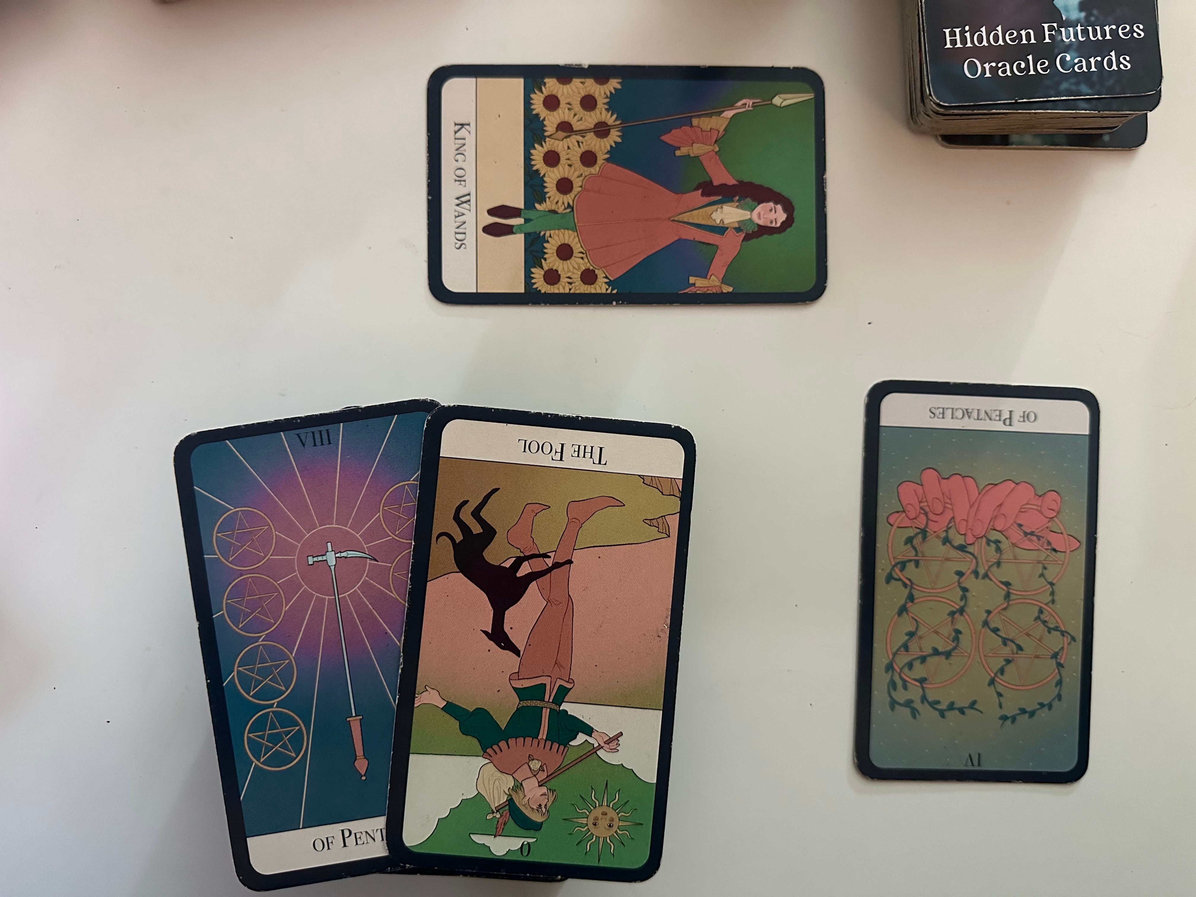 In the next screenshot, you can see the Four of Pentacles reversed with The Fool reversed, and the Eight of Pentacles at the bottom. So again, this is about releasing control over expected outcomes, releasing attachments, and anything else of the sort that you’ve been gripping onto. For some of you, this release is going to feel like vulnerability, like letting something fall apart or letting go of something you might’ve once deeply valued, but you now know cannot be carried forward with you.