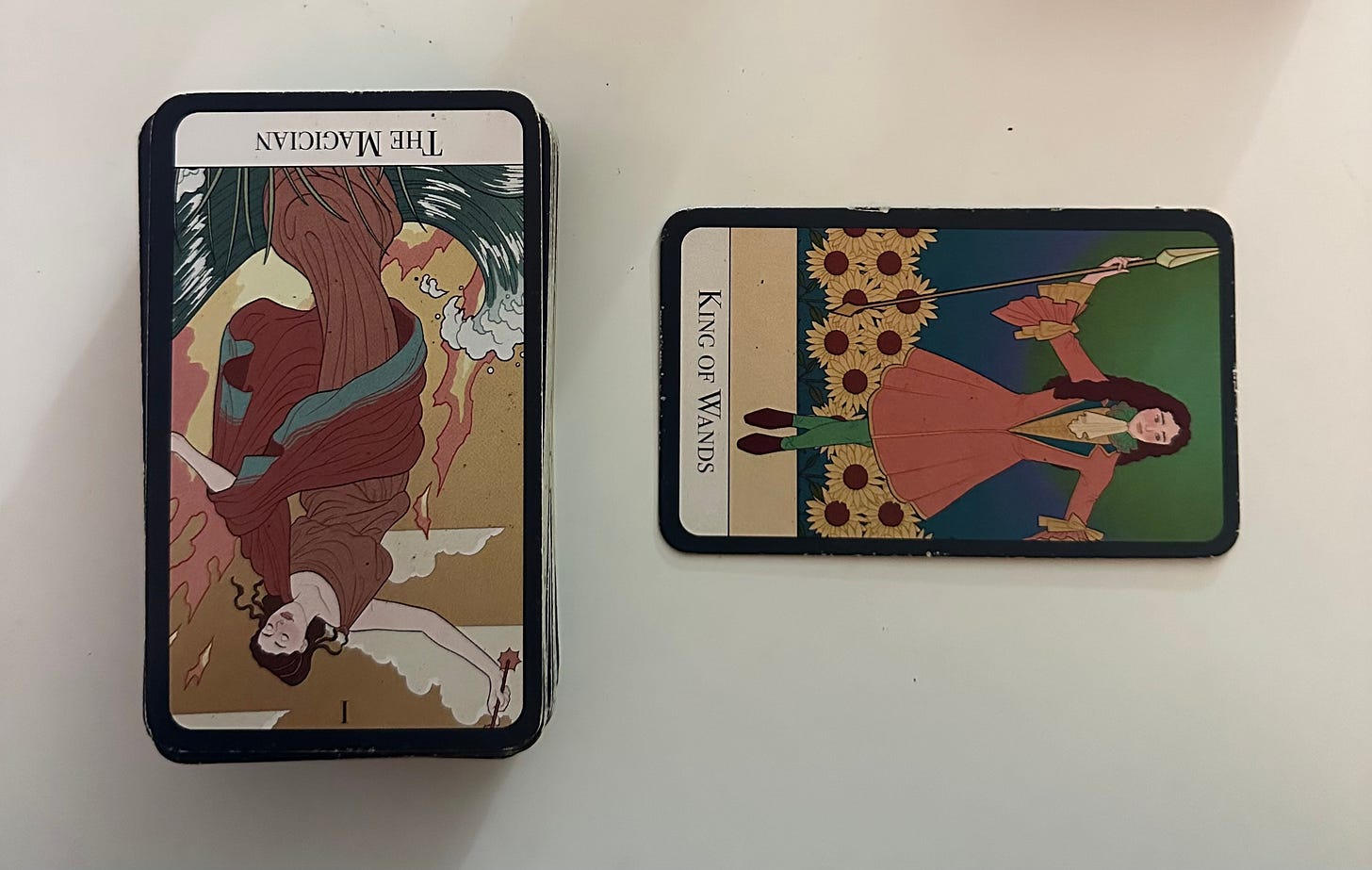 The first card coming out is the King of Wands sideways to the right, with the Magician at the bottom of the deck. This feels like the collective is slowly stepping back into their fire and their dominance.